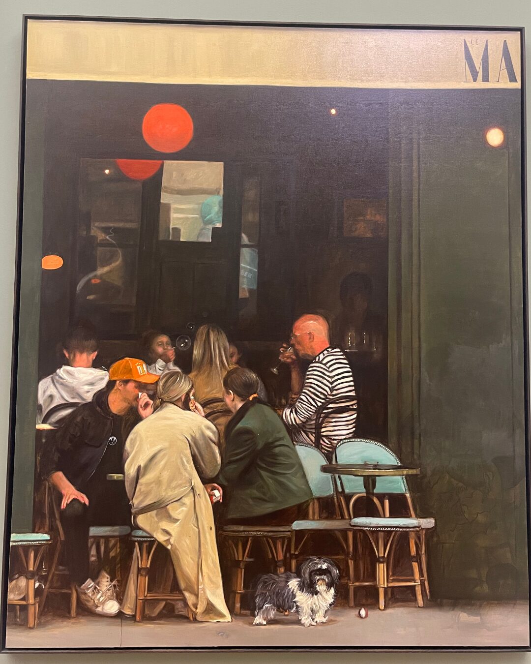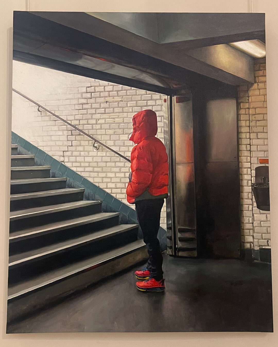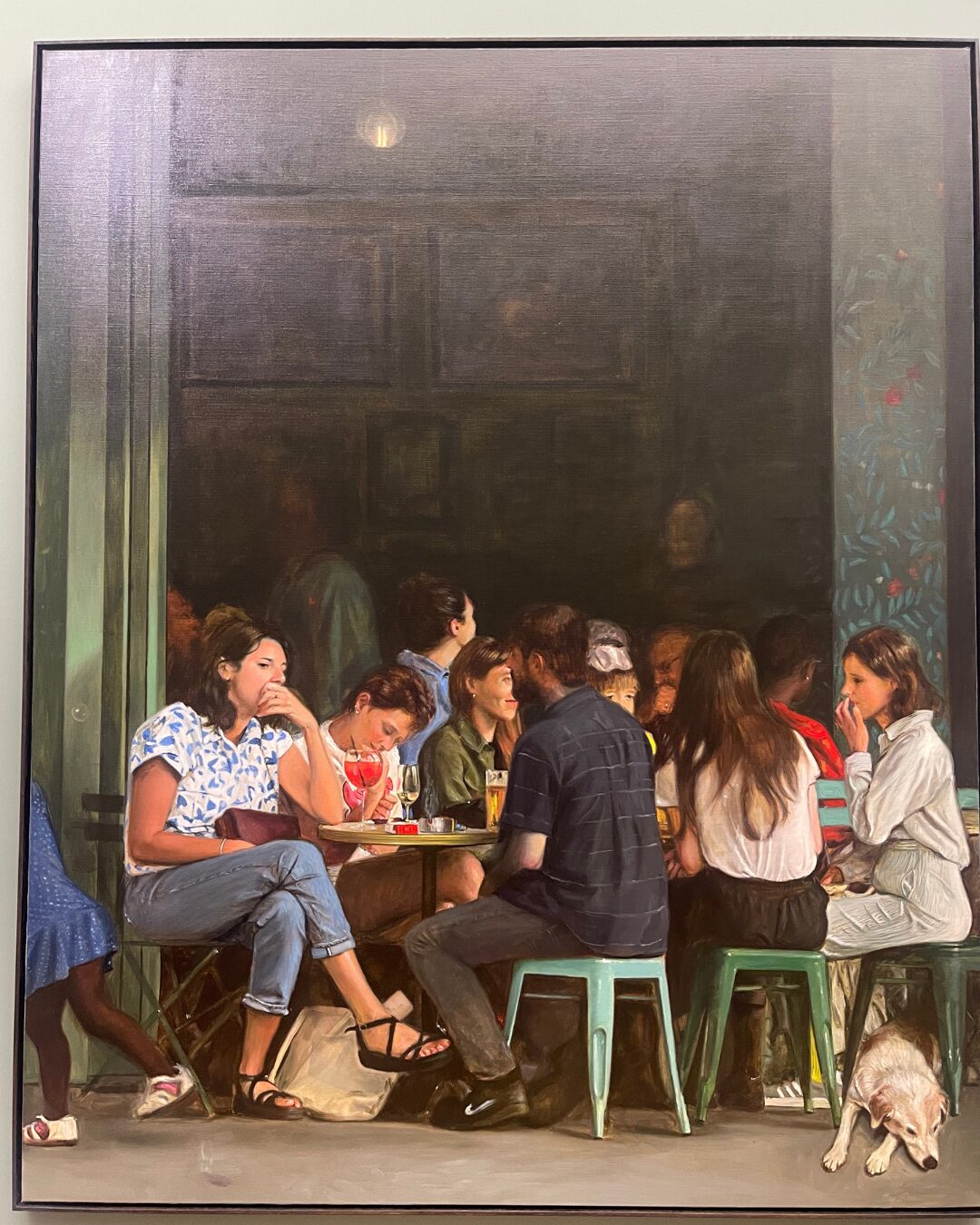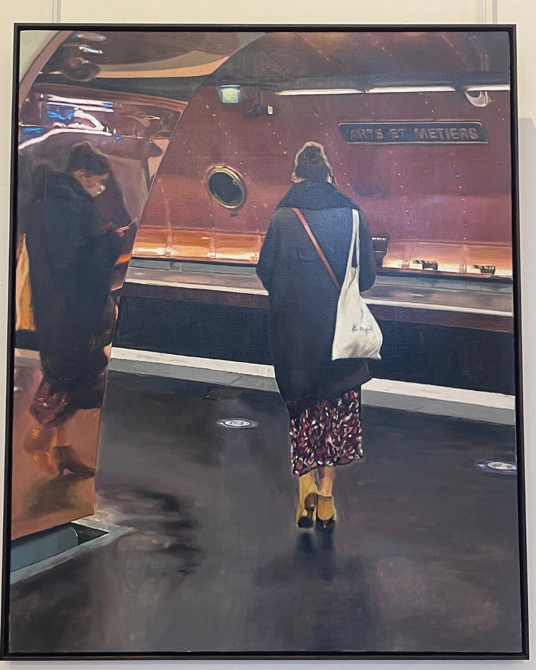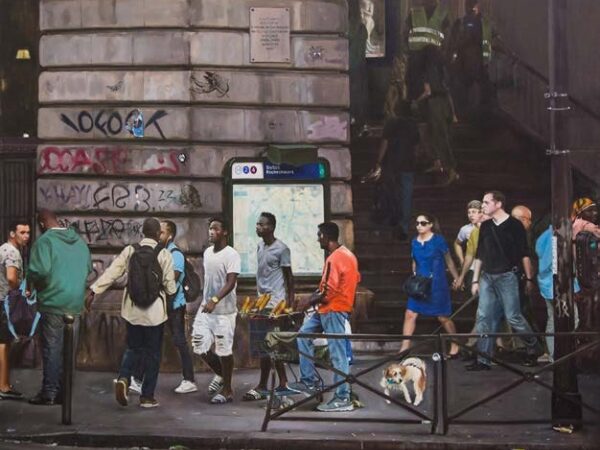 Né en Algérie en 1947, Bilal Hamdad s’y est formé avant de venir en France où il a notamment suivi les enseignements des Beaux-Arts de Paris. Ce qui surprend au premier regard porté sur ses grandes toiles, c’est le sentiment de faire face à des photos représentant pour la plupart des scènes de vie parisiennes très réalistes : des personnes attablées en terrasse, d’autres devant une bouche de métro, des personnes seules dans une station souterraine… Puis, en s’approchant, on réalise qu’il s’agit de peinture, un travail méticuleux à l’huile s’inscrivant dans une certaine continuité artistique avec les autres œuvres exposées. L’artiste travaille à partir de photos prises sur le vif, interpellé par une scène, des couleurs, une ambiance…