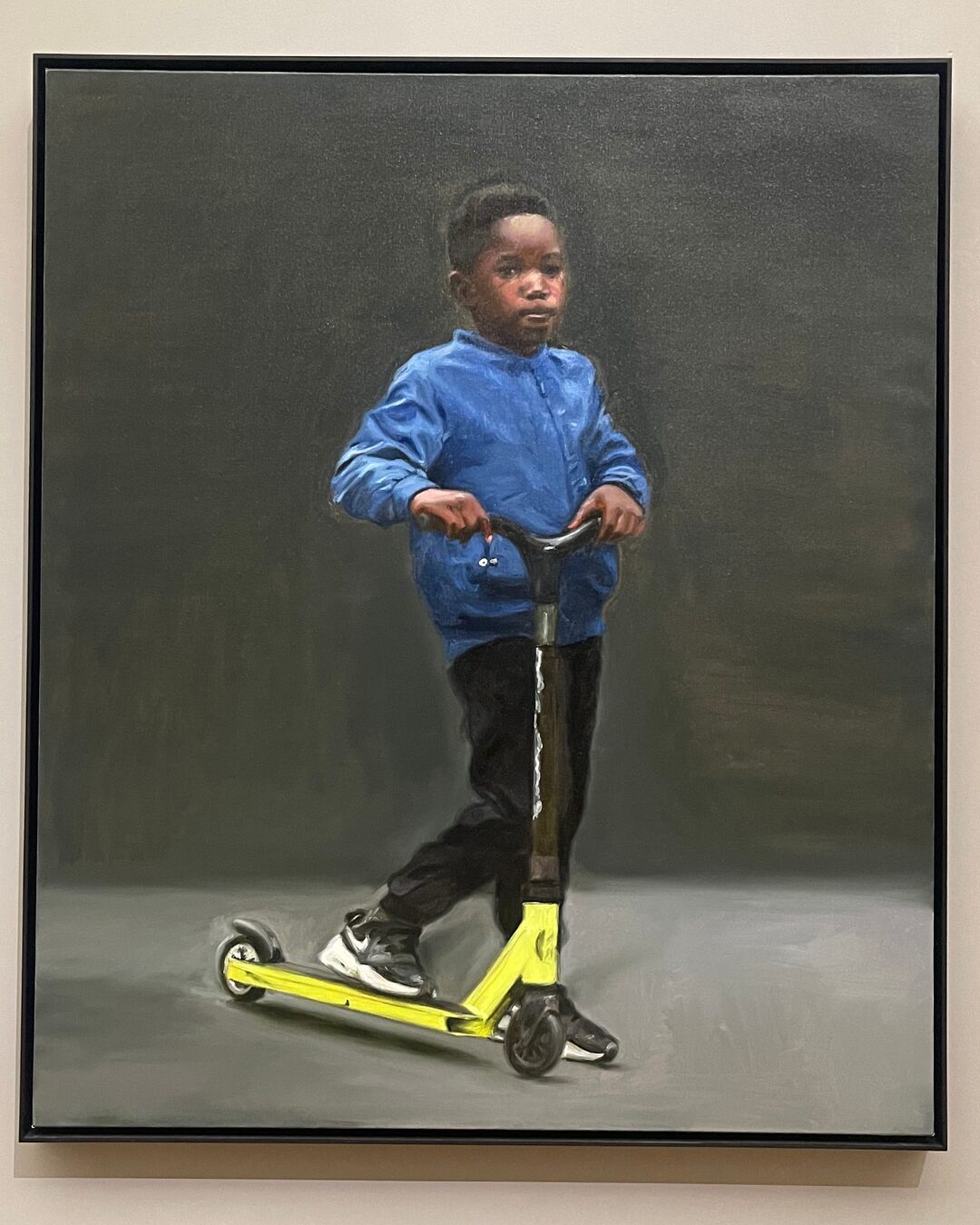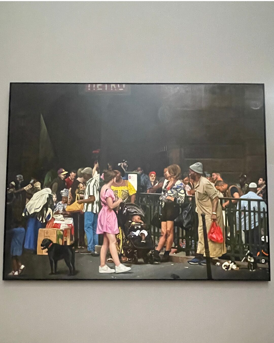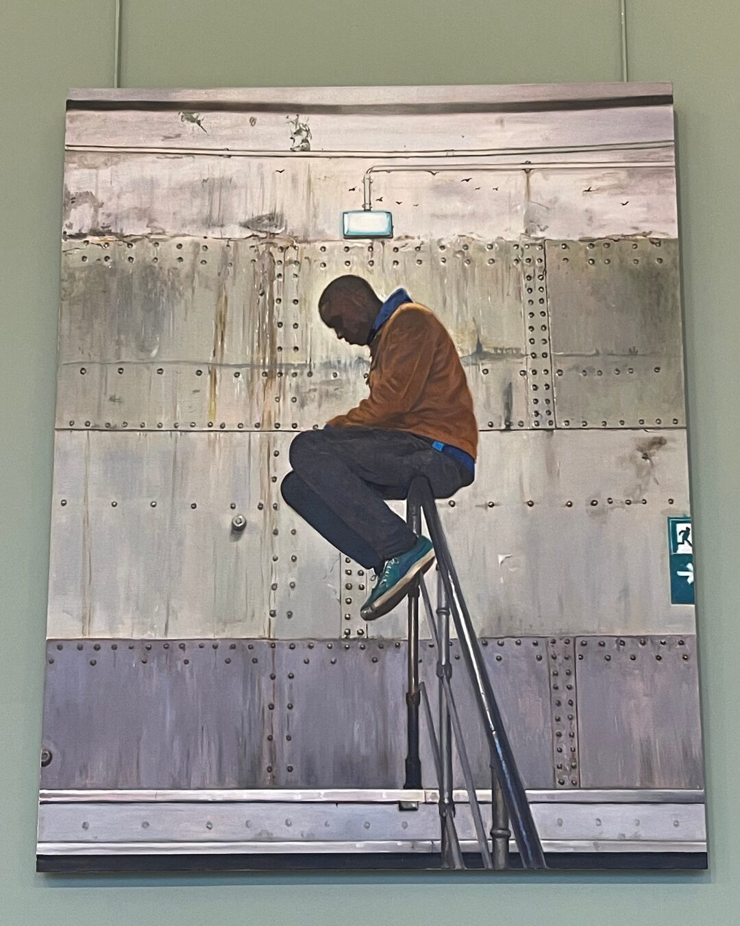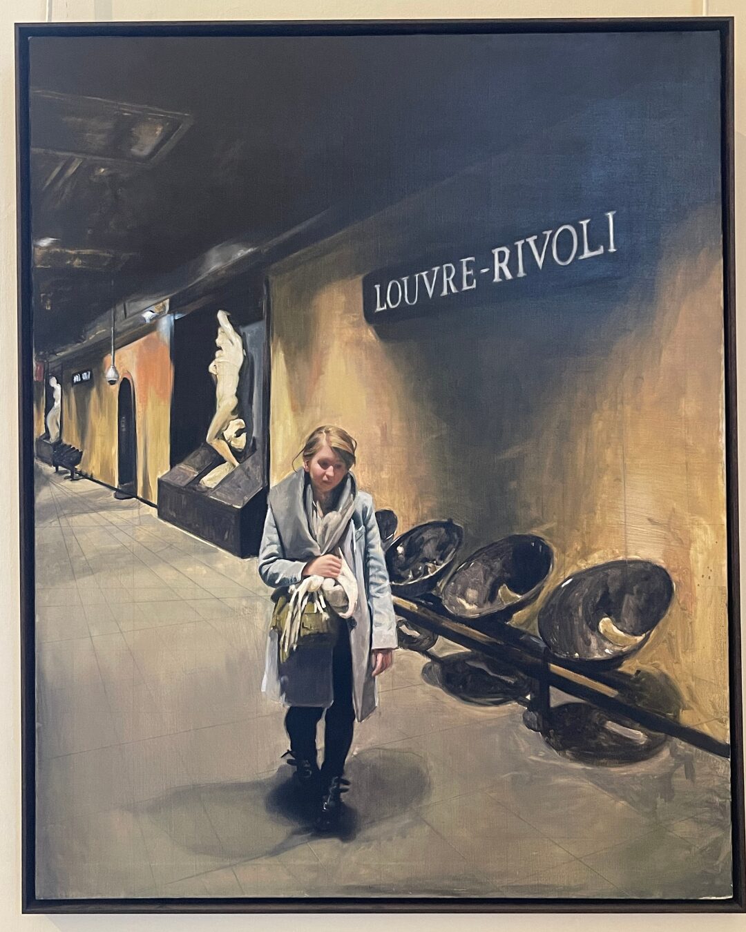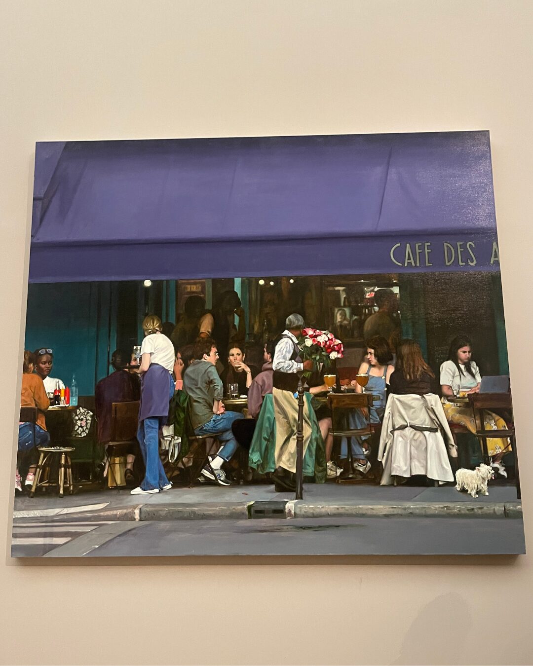Né en Algérie en 1947, Bilal Hamdad s’y est formé avant de venir en France où il a notamment suivi les enseignements des Beaux-Arts de Paris. Ce qui surprend au premier regard porté sur ses grandes toiles, c’est le sentiment de faire face à des photos représentant pour la plupart des scènes de vie parisiennes très réalistes : des personnes attablées en terrasse, d’autres devant une bouche de métro, des personnes seules dans une station souterraine… Puis, en s’approchant, on réalise qu’il s’agit de peinture, un travail méticuleux à l’huile s’inscrivant dans une certaine continuité artistique avec les autres œuvres exposées. L’artiste travaille à partir de photos prises sur le vif, interpellé par une scène, des couleurs, une ambiance…