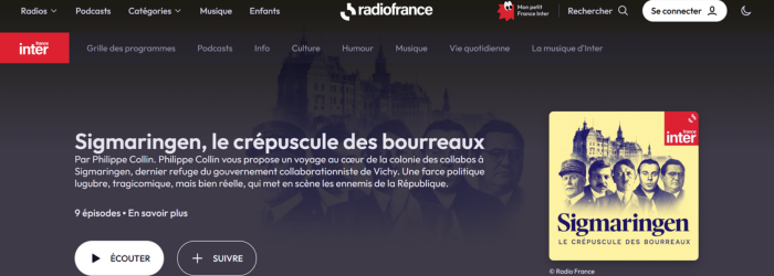 Se lancer dans un podcast de huit épisodes d’une heure chacun portant sur Sigmaringen, dont j’ignorais à peu près tout, n’avait rien d’évident, d’autant que je réserve leur écoute au temps passé en voiture, assez limité au quotidien… Perspective vertigineuse et j’avoue avoir un peu hésité. Mais une fois embarquée, je me suis mise à enchaîner les épisodes en dehors de tout trajet, juste pour le plaisir de poursuivre.